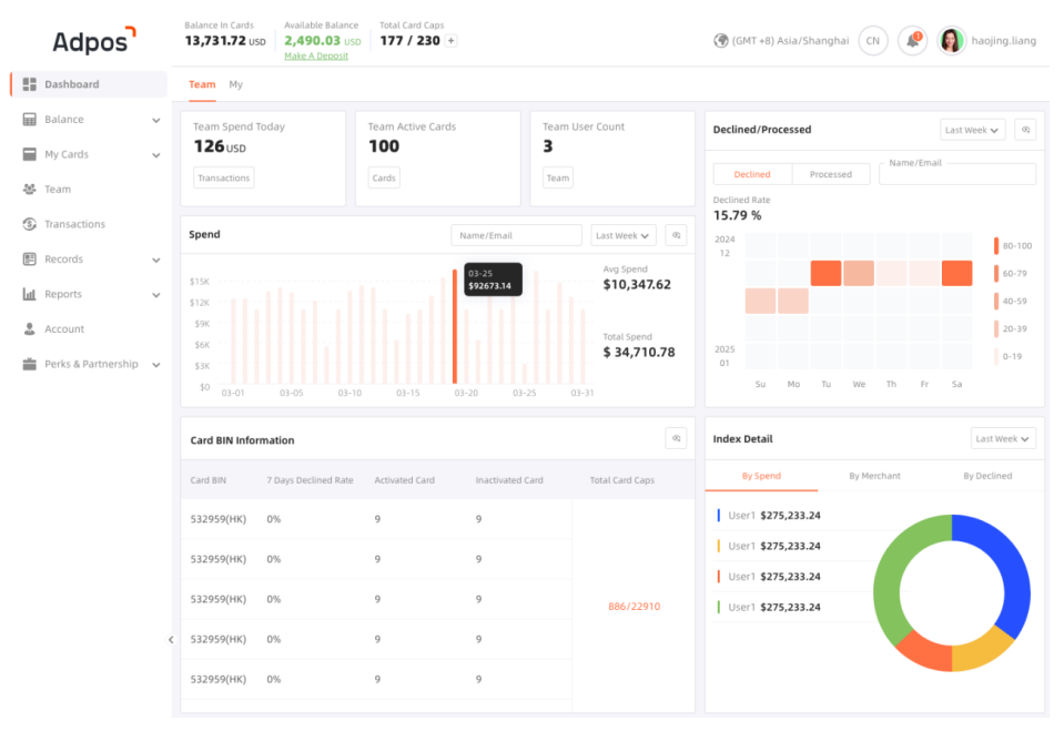 不同于其他支付公司的虚拟卡产品,Adpos 专注于广告支付这一垂直应用场景,所有功能都是围绕广告投放以及优化师团队管理而开发,并拥有适用于各大广告平台的优势卡段。